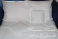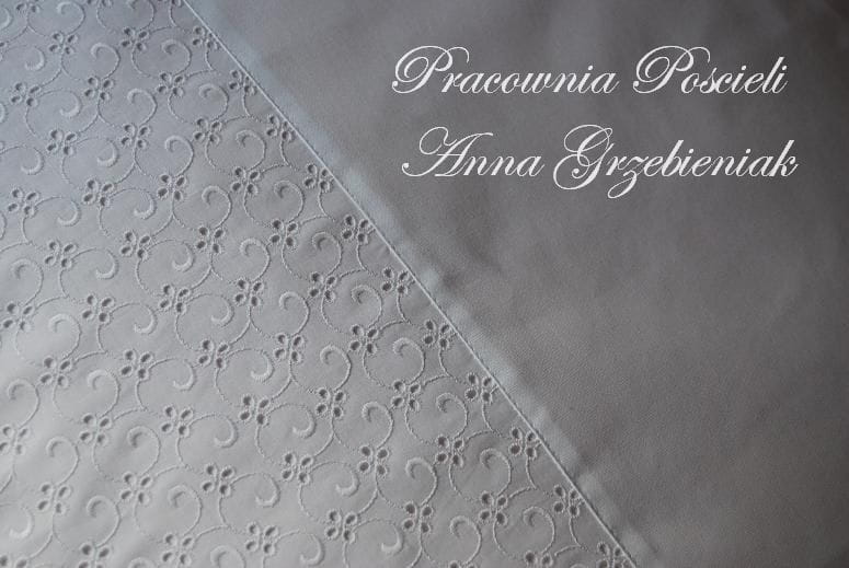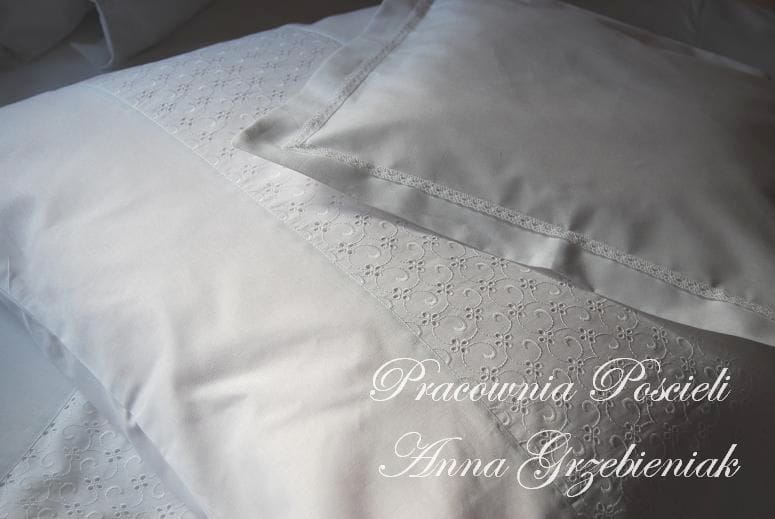 Pościel uszyta z białego płótna bawełnianego i haftowanego batystu - haftowany batyst ozdabia poszewki na poduszki oraz poszwę na kołdrę.