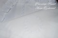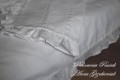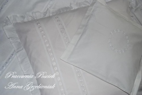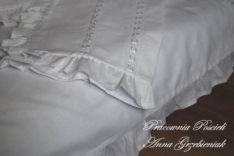 Poszewki na poduszki oraz poszwa na kołdrę ozdobione są delikatnymi wstawkami z haftowanego batystu. Dodatkową ozdobą są gęsto marszczone falbanki - na poszewkach wszyte z trzech stron, w poszwie na kołdrę wszyte są po dwóch dłuższych bokach, co daje piękny efekt po rozłożeniu na łóżku.