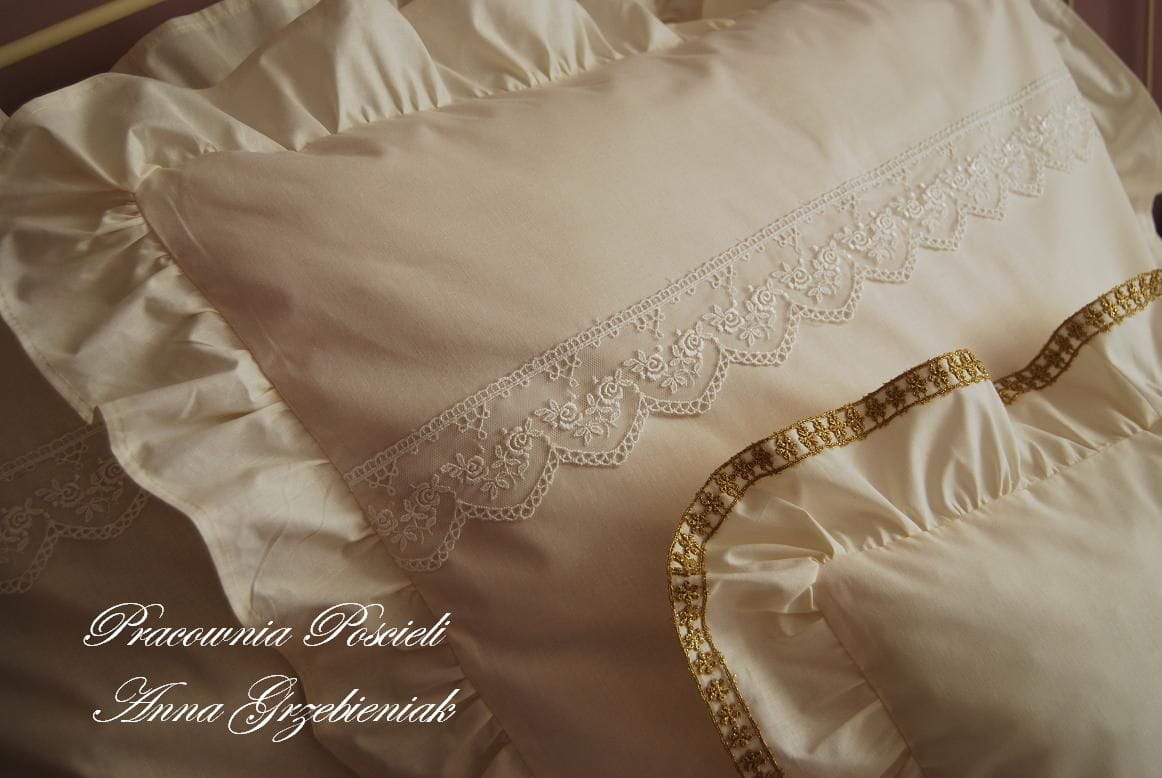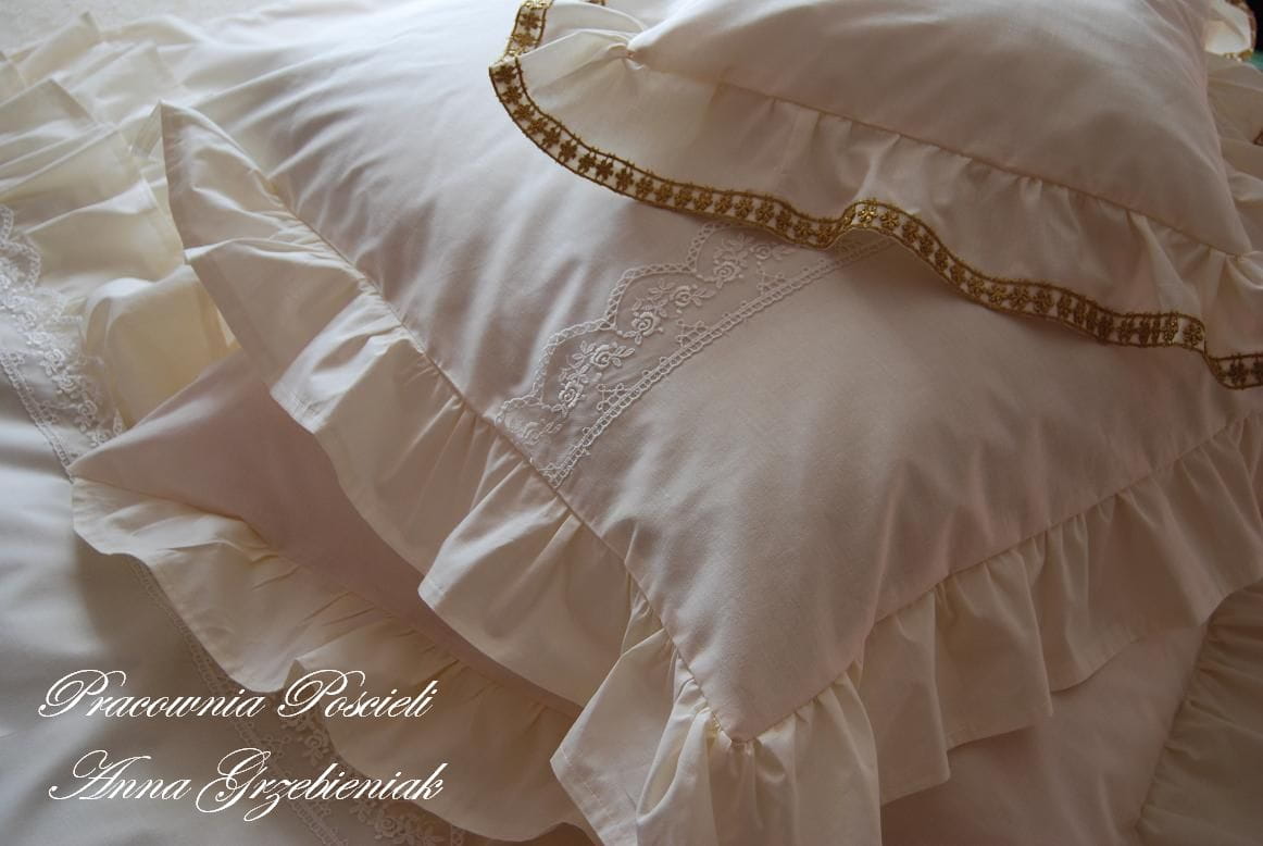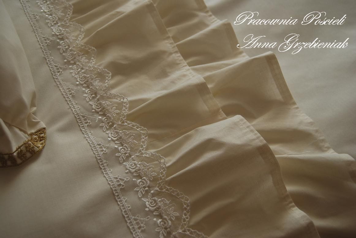 Komplet pościeli uszyty z miękkiej, kremowej bawełny, ozdobiony wyjątkowymi dodatkami - pięknym tiulem w malutkie różyczki i śliczną, złotą taśmą. I mnóstwem falbanek...