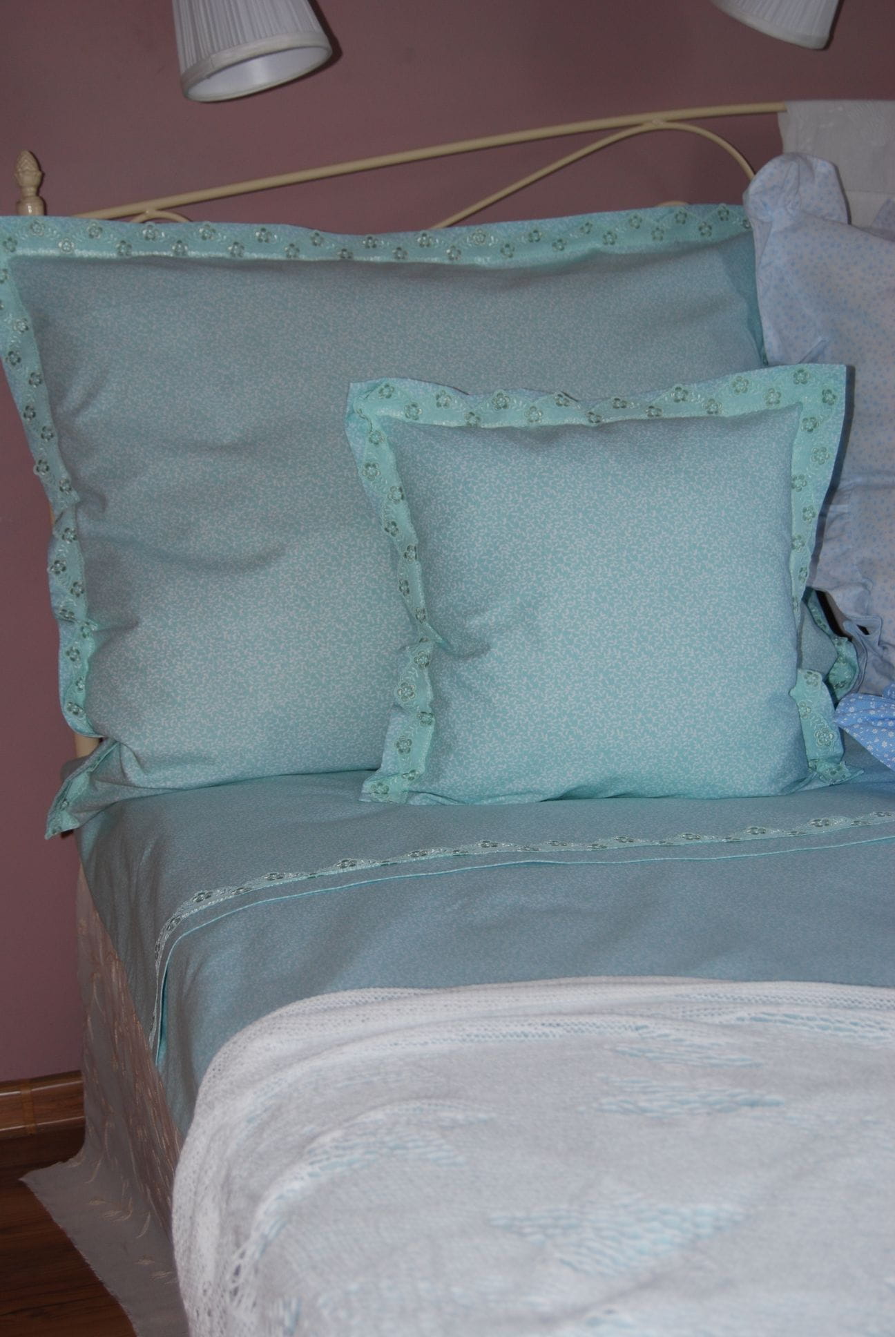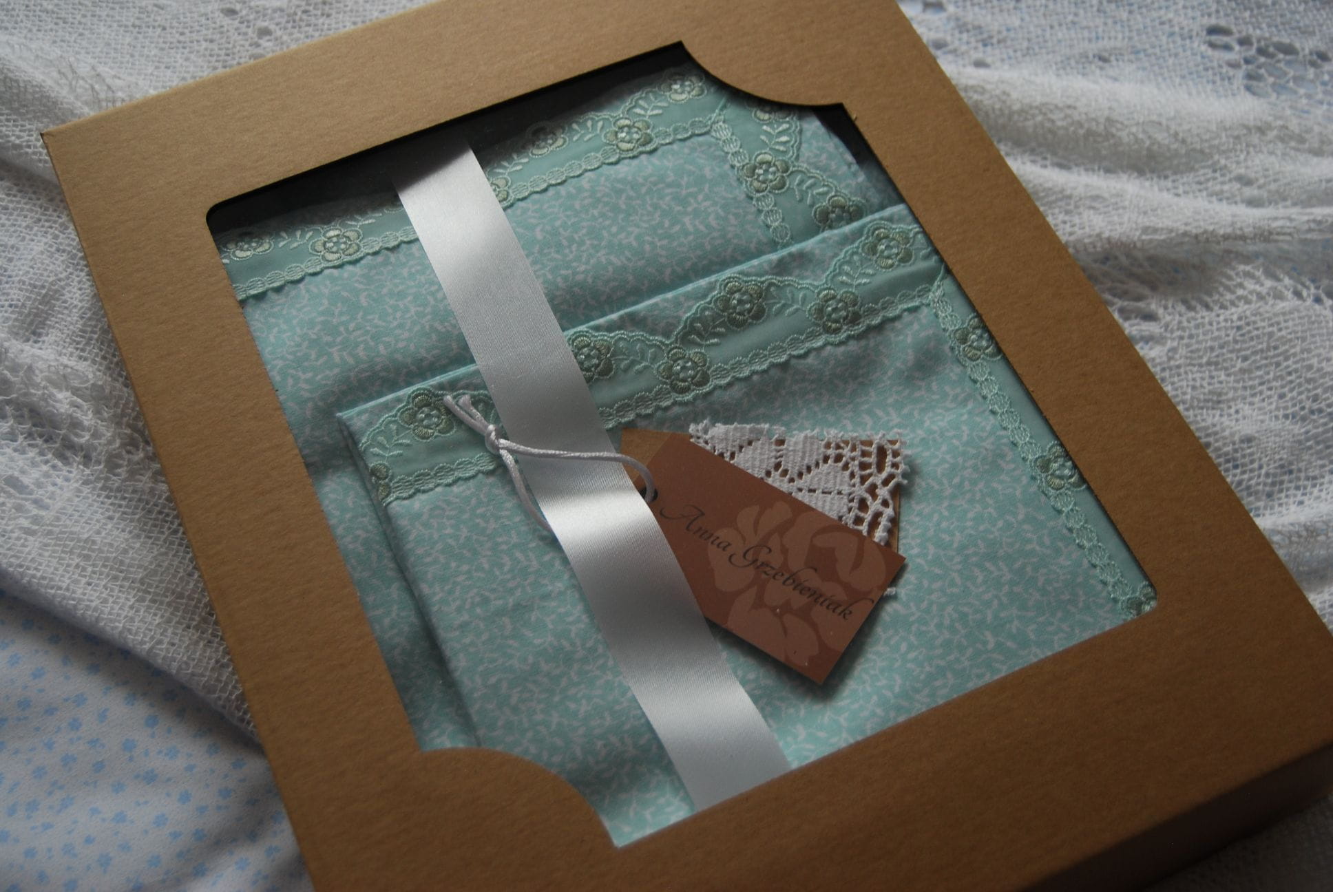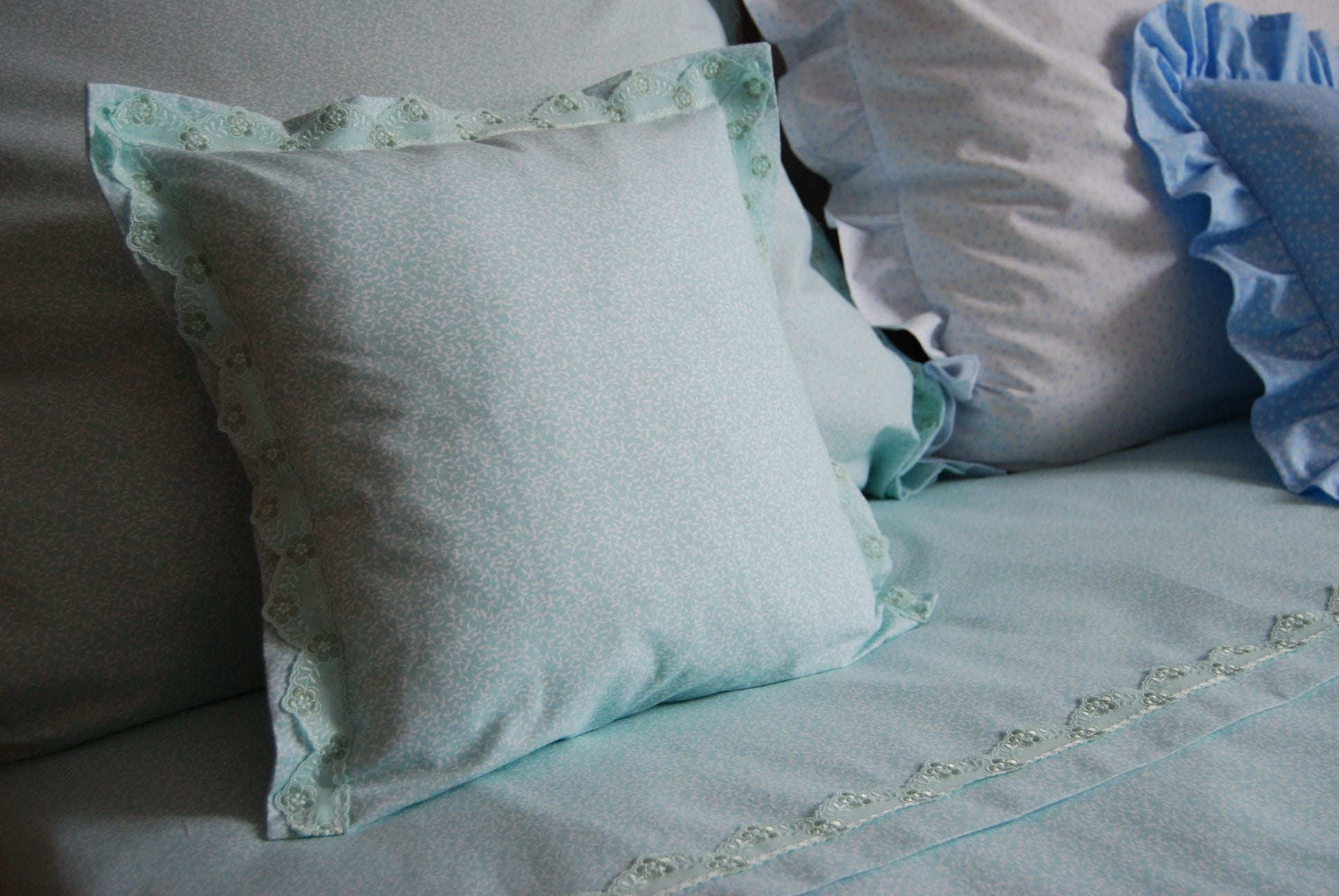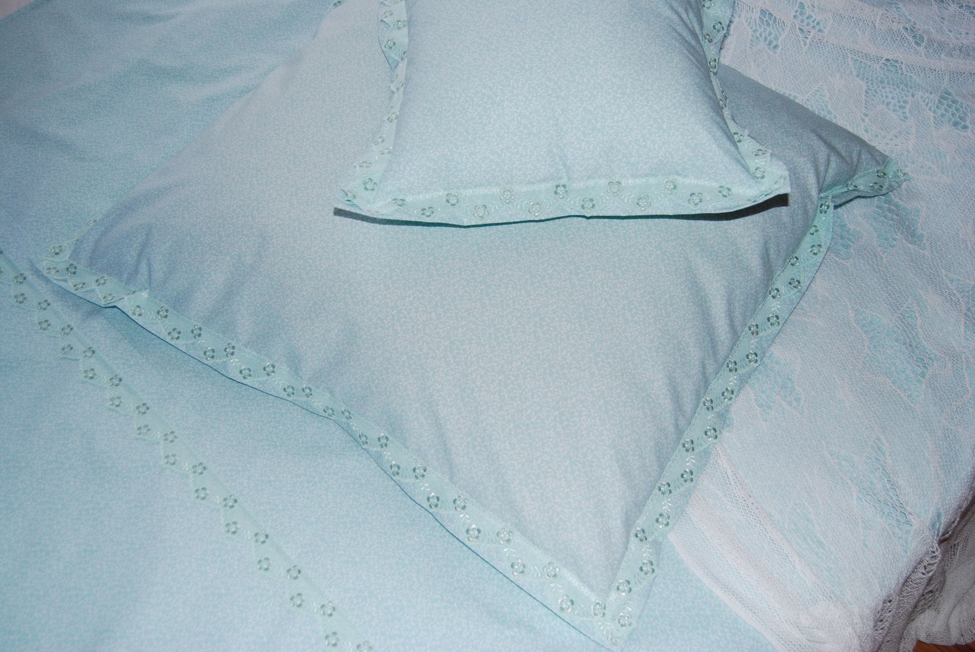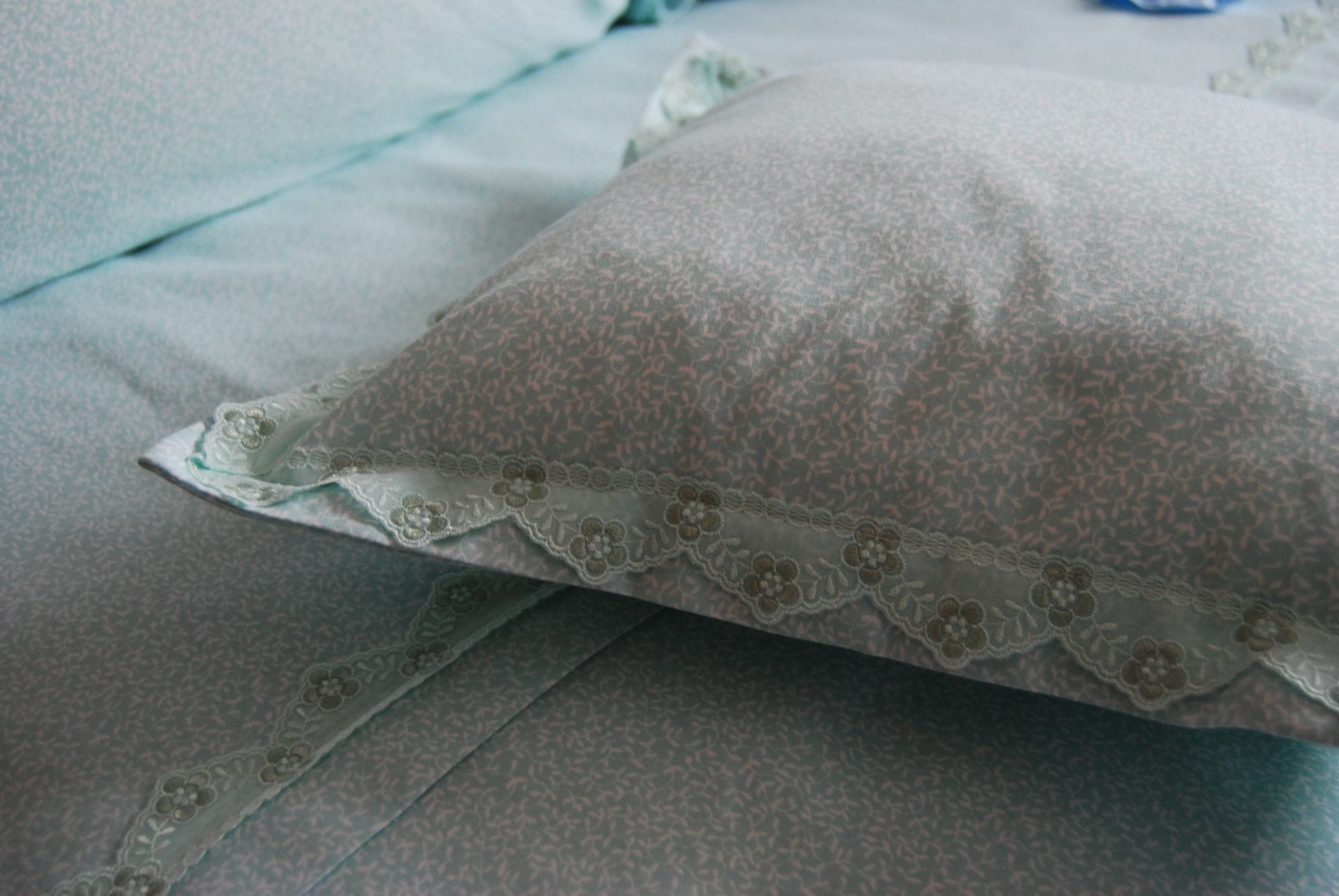 Komplet pościeli z miętowej bawełny ozdobiony delikatną koronką.