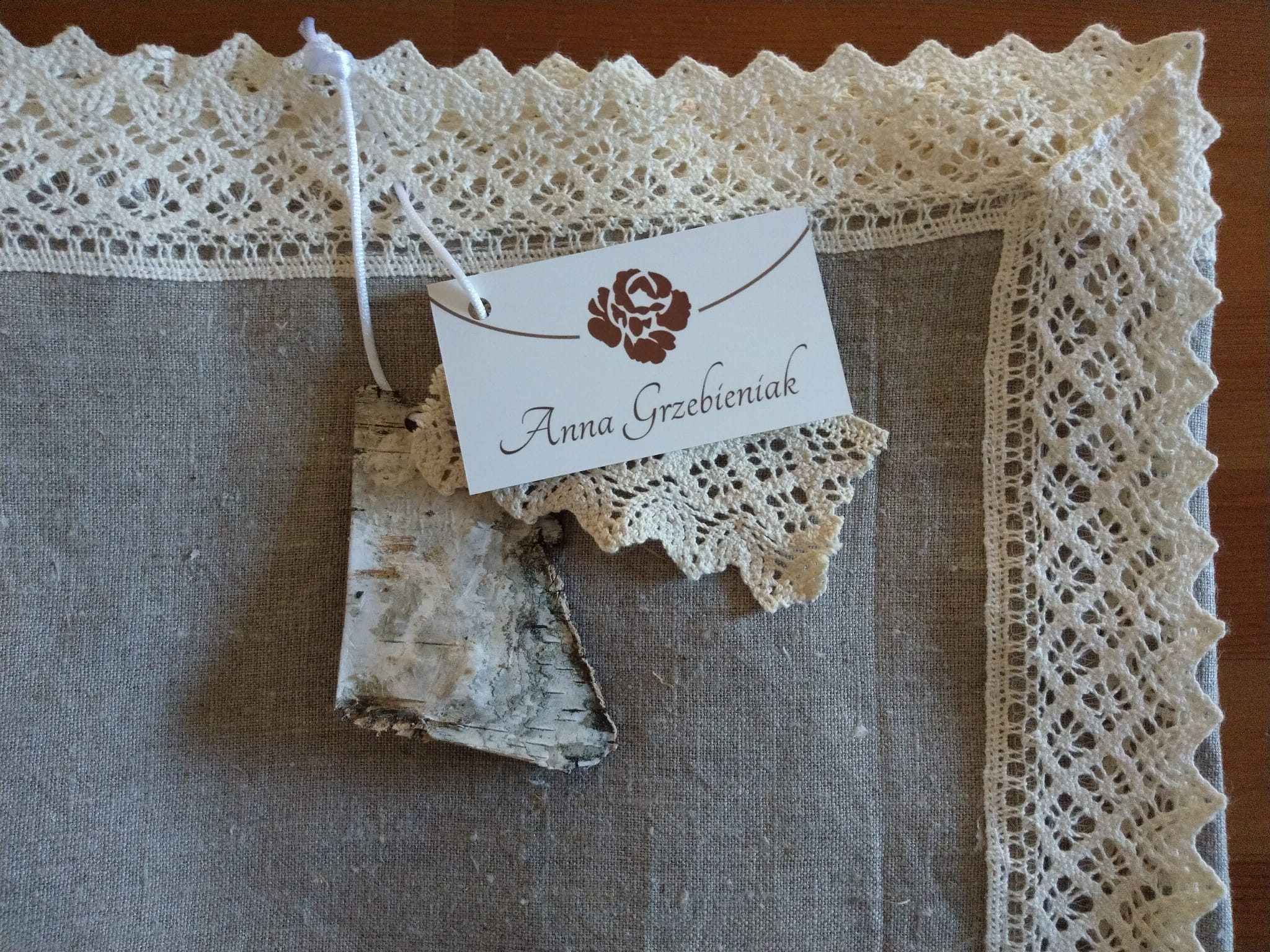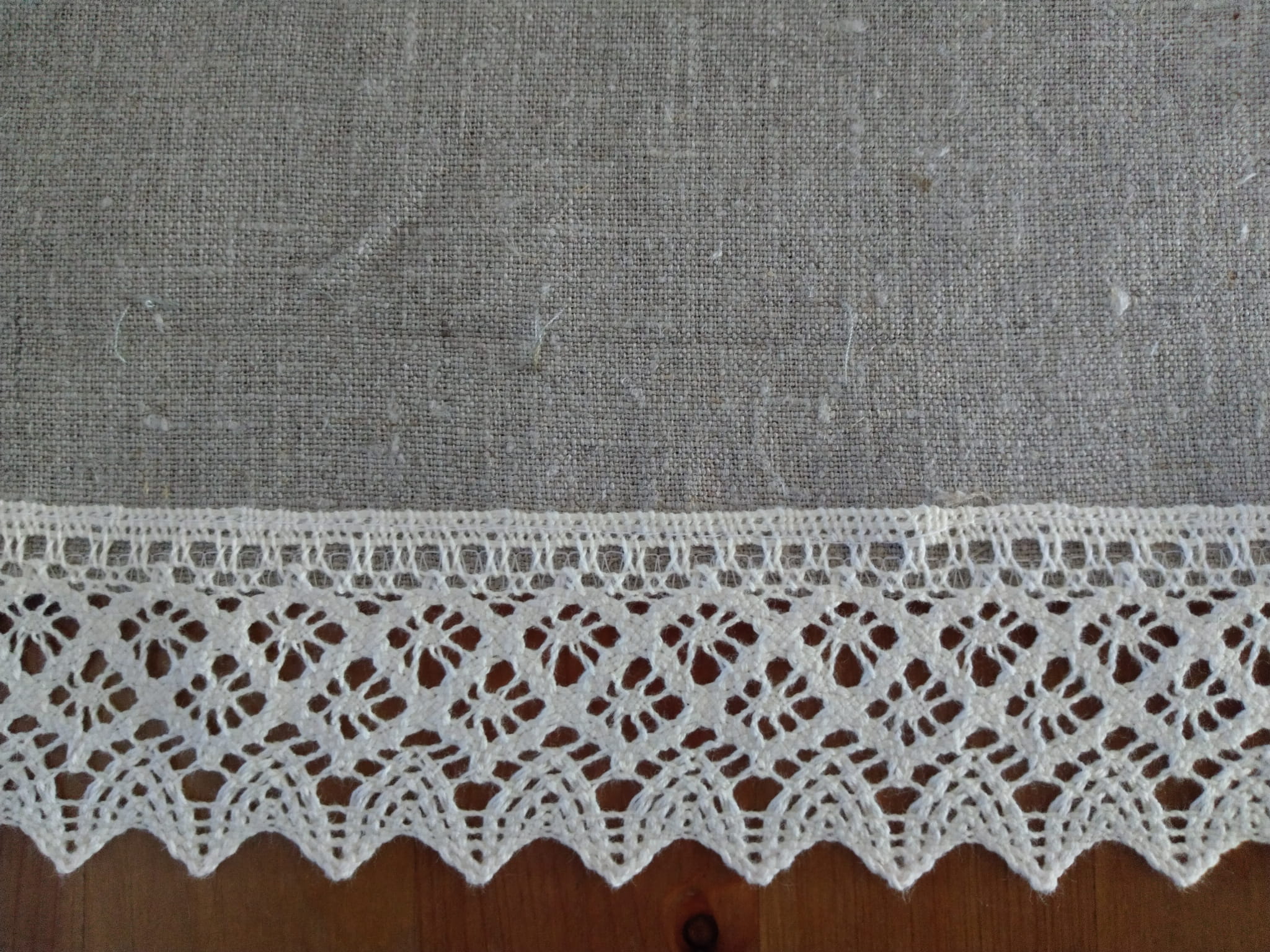 Obrus uszyty z lnu w naturalnym kolorze, ozdobiony kremową koronką klockową.