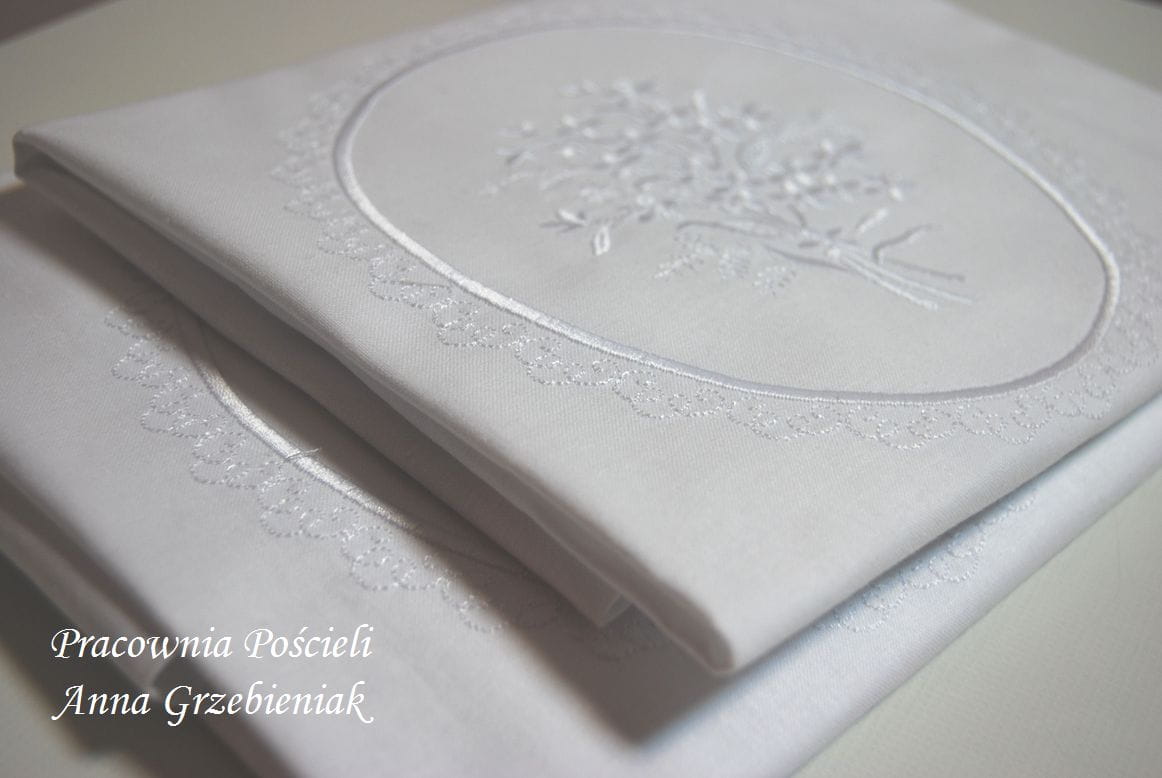 Poszewka uszyta z białego płótna bawełnianego, ozdobiona pięknym haftowanym medalionem (haft wykonany maszynowo).