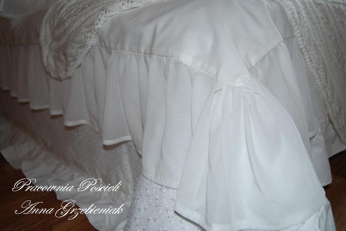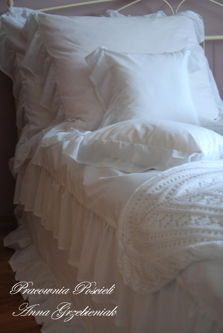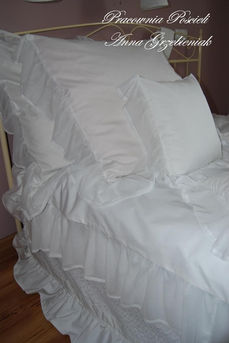 Komplet pościeli, uszyty z białego płótna bawełnianego z dodatkiem zwiewnego batystu - bogato zdobiony falbankami.