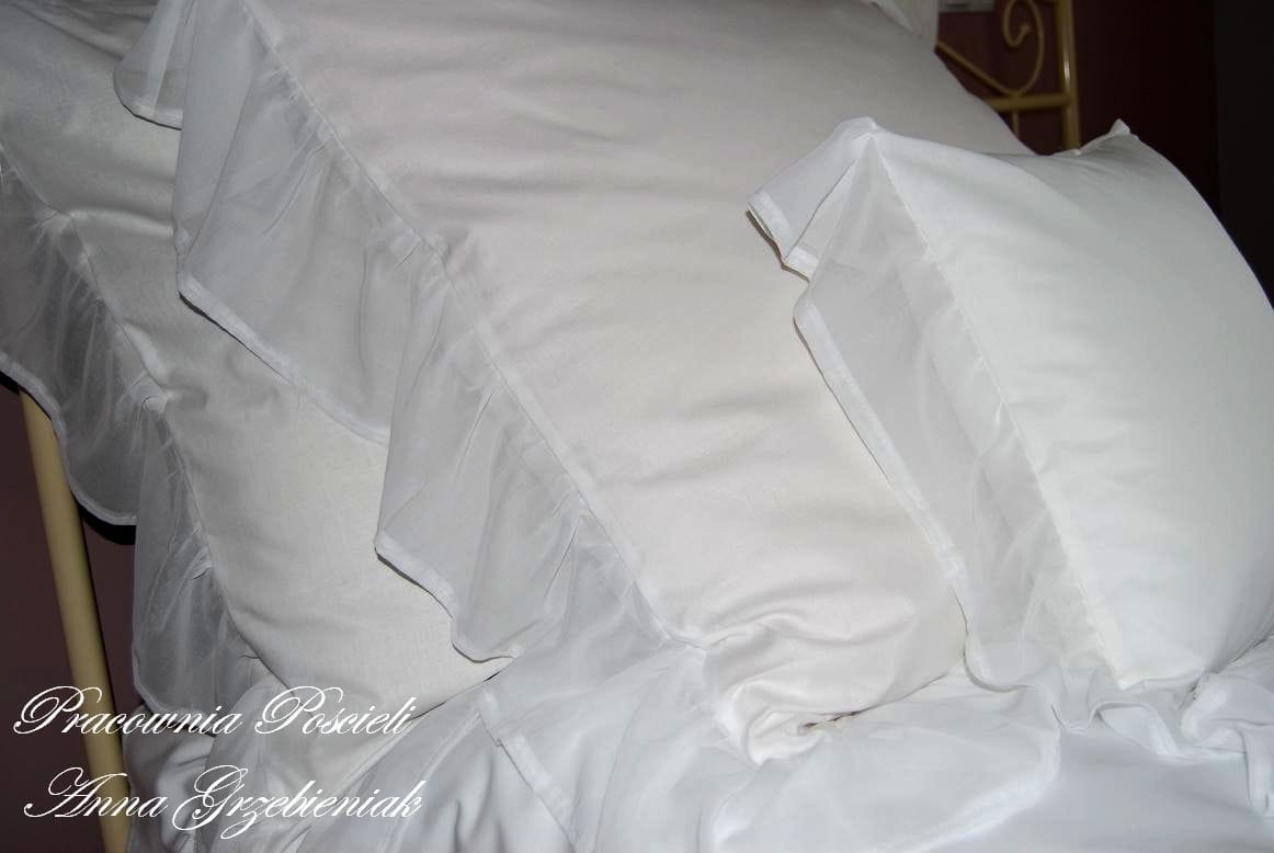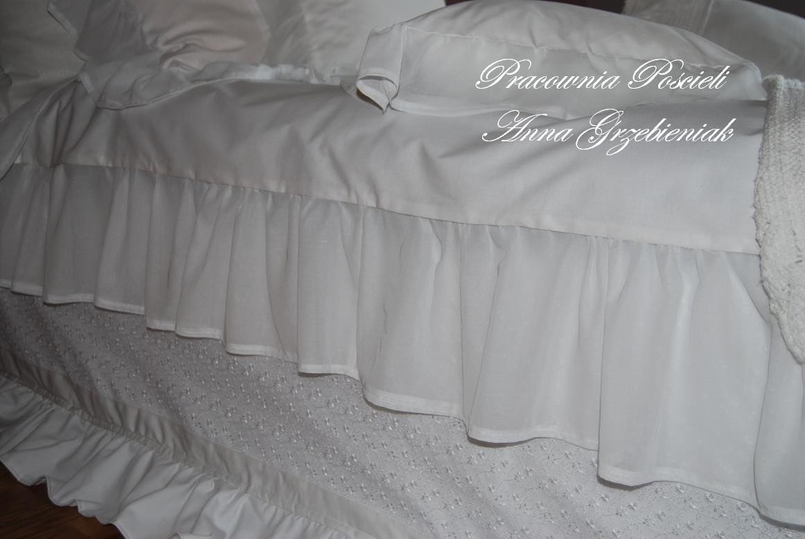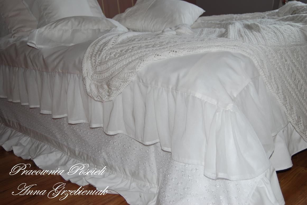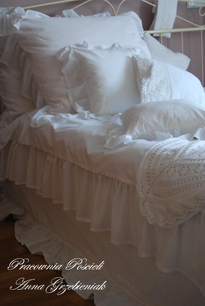 Komplet pościeli, uszyty z białego płótna bawełnianego z dodatkiem zwiewnego batystu - bogato zdobiony falbankami.