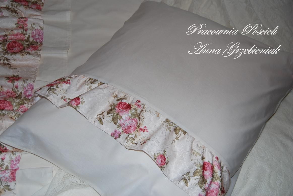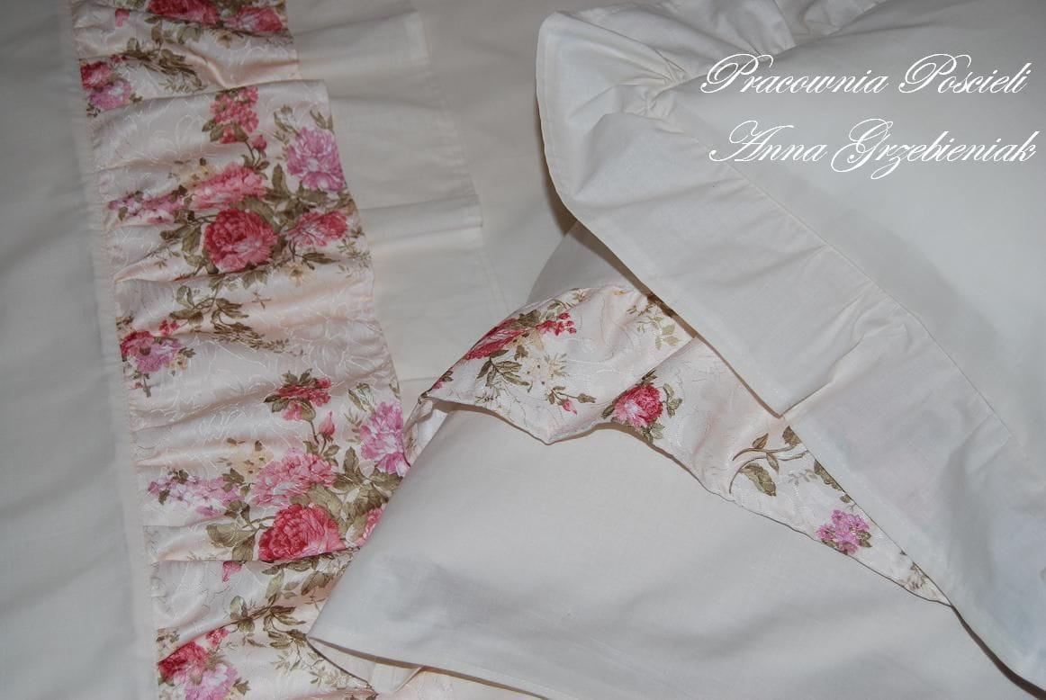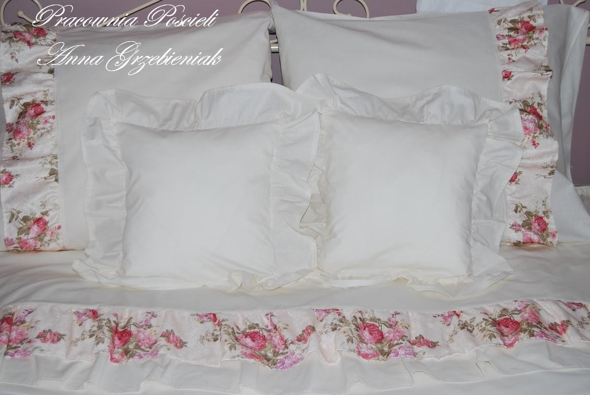 Każda z części ozdobiona jest falbankami w piękny, różany wzór - poszwa na kołdrę posiada dwie falbany wszyte ok 60cm od góry - jedną gładką, kremową, drugą - w róże. Poszewki na poduszki - zamykane na zakład, po bokach, symetrycznie mają wszytą falbanę, małe poszewki na jaśki - obszyte są dookoła gładką, gęsto marszczoną falbanką.