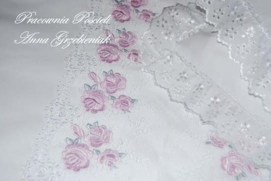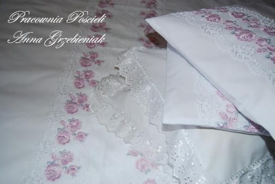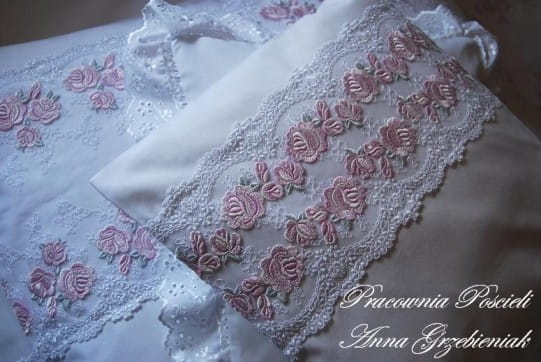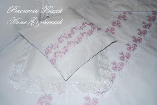 Poszewki na poduszki i duża poszwa z aplikacją z koronki, naszytą poziomo, małe poszewki z haftowaną, batystową falbanką.