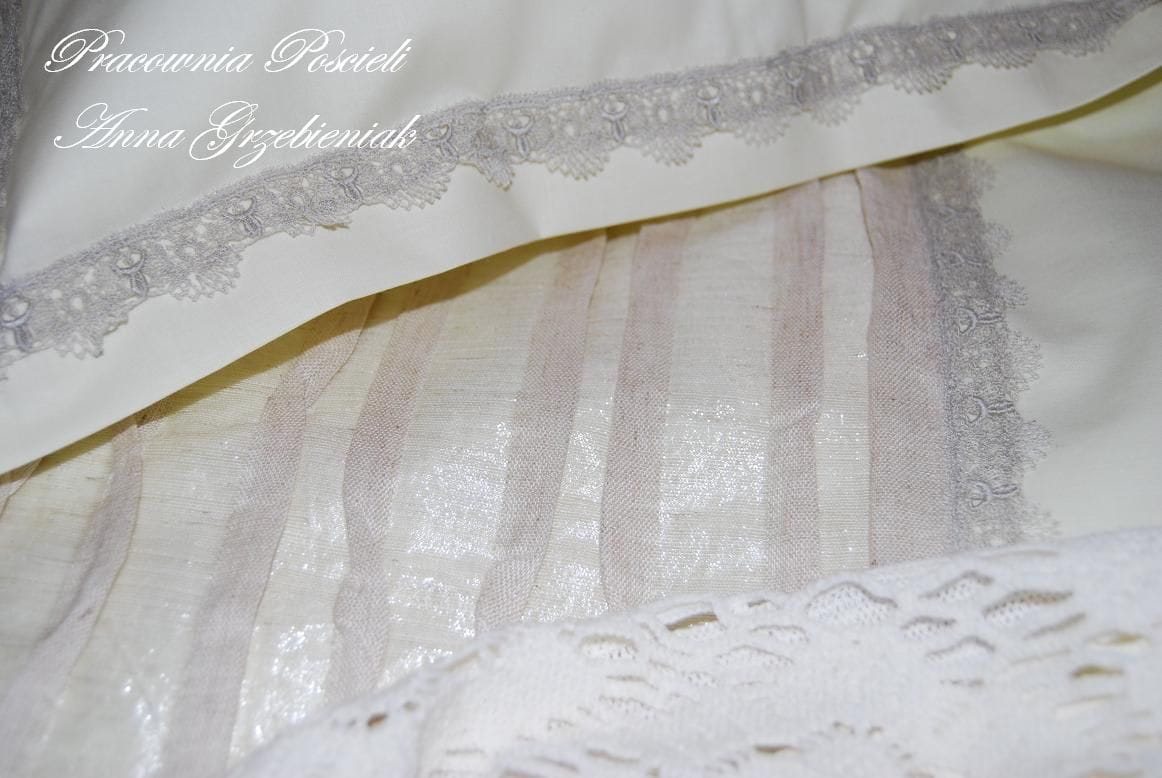 Poszewki na poduszki oraz poszwa na kołdrę ozdobione wstawkami z z oryginalnej, efektownej tkaniny - lniane pliski przeplatane delikatną, błyszczącą nitką.