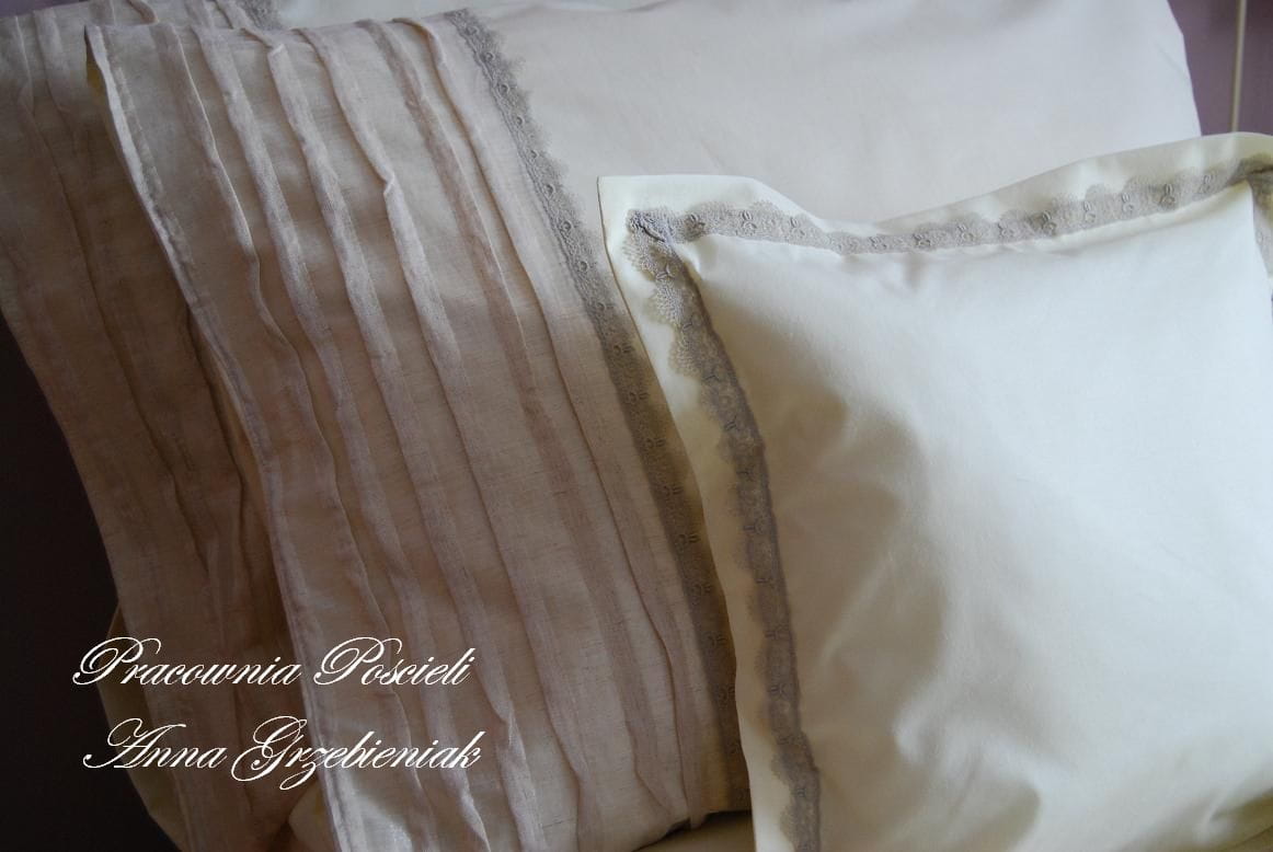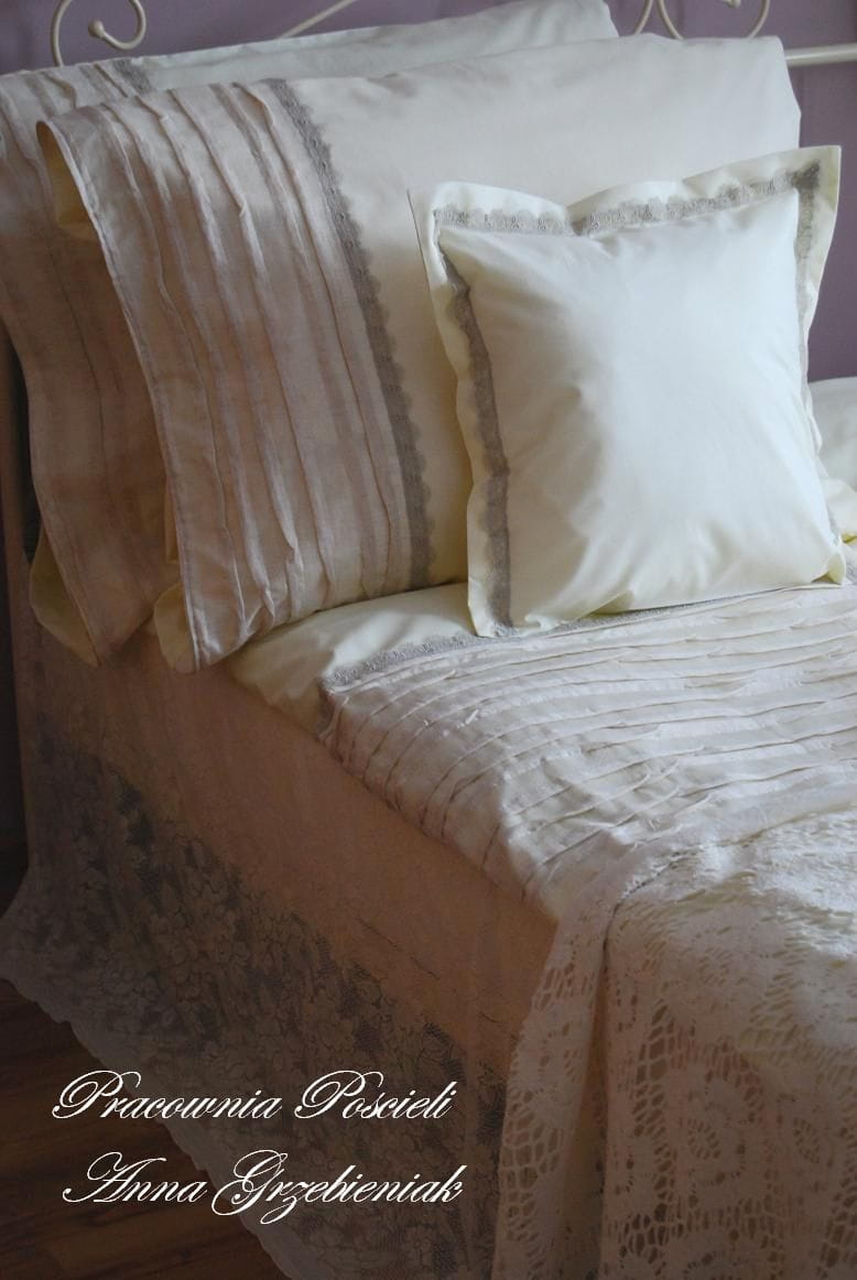 Komplet pościeli uszyty z kremowej tkaniny pościelowej z dodatkami z gniecionego, plisowanego lnu.