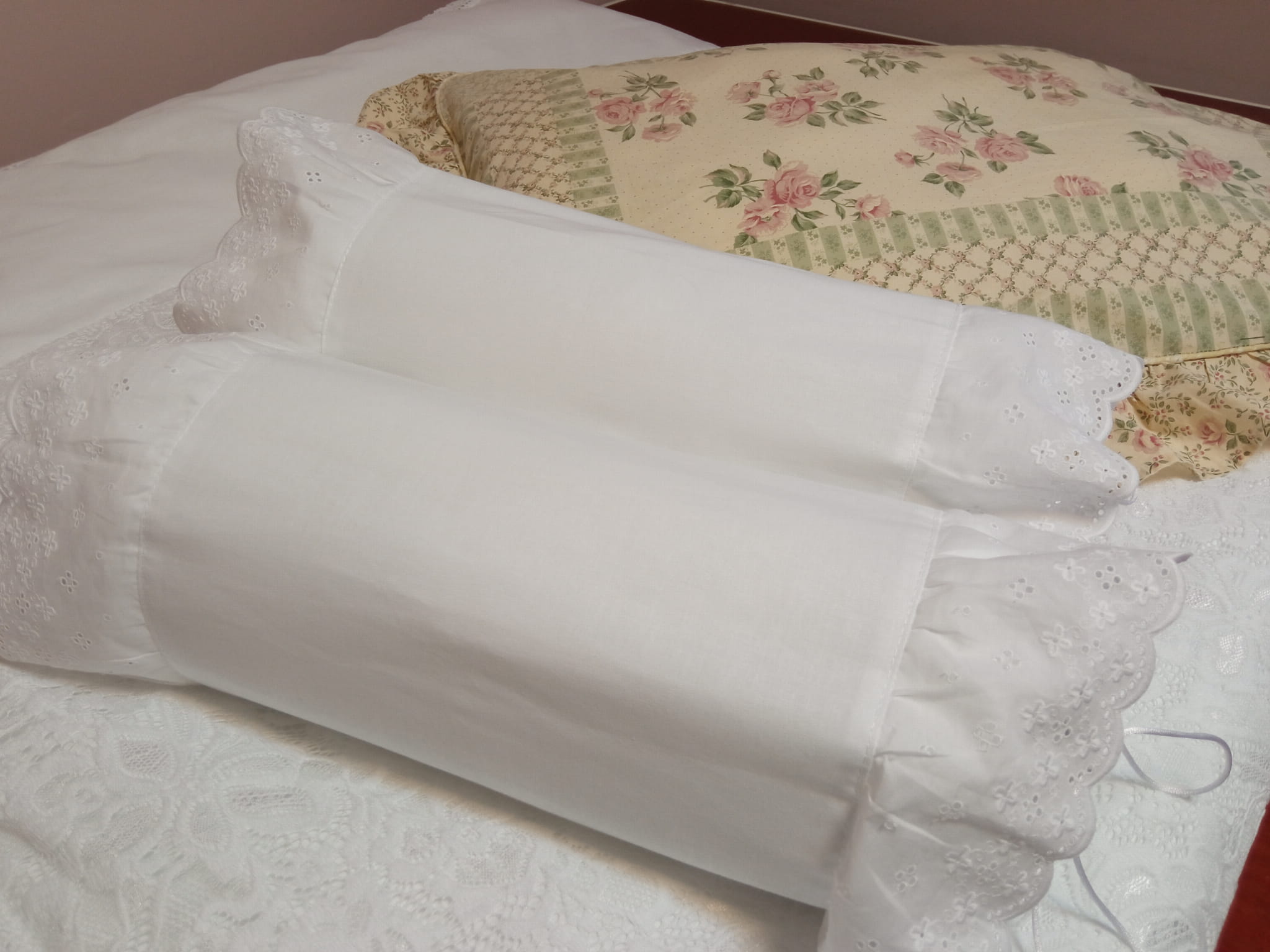 Poszewka - uszyta z doskonałej jakości bawełny, wiązana po bokach na sznureczki, z falbankami z haftowanego batystu.